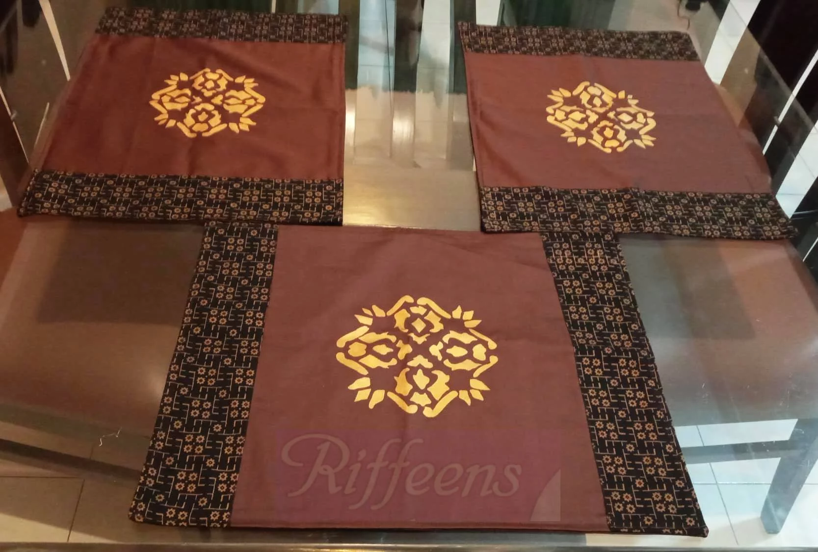brown with golden/black screen printed patchwork mat