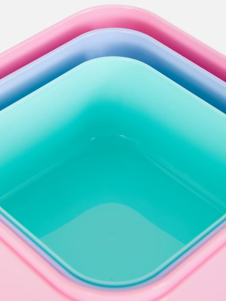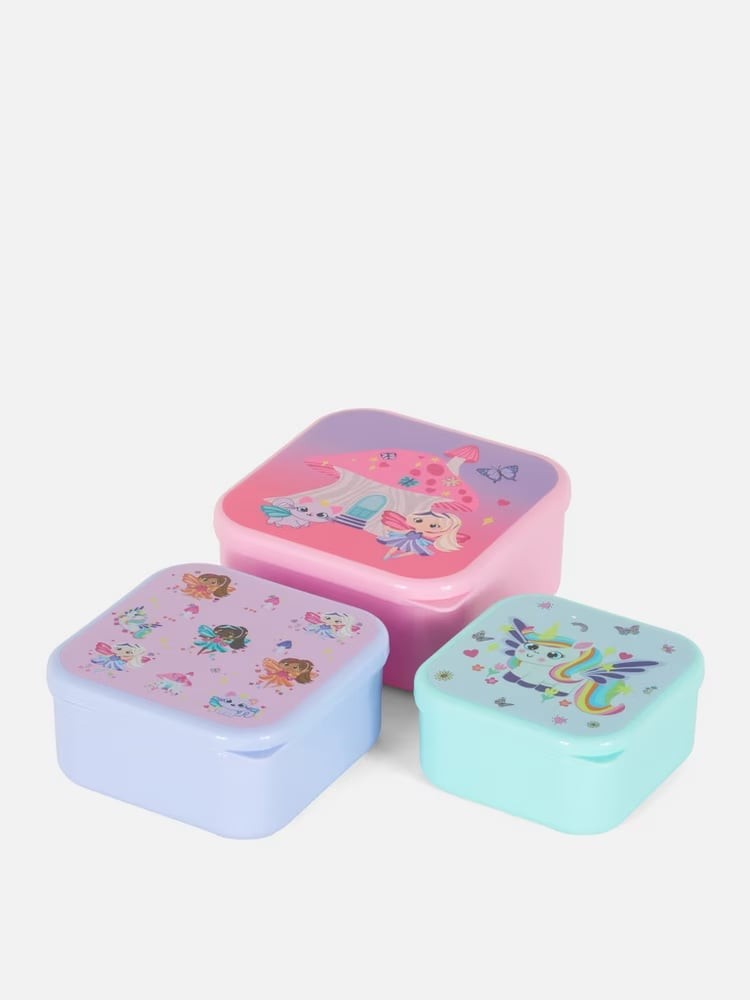 Keep snack time fun and organised with this set of three stackable snack pots. Each square pot has rounded corners and comes with a fitted lid to help keep contents fresh and secure. The largest pot features a pink base and a purple lid decorated with a fairy-tale princess graphic, while the medium pot sports a lavender base with a lid covered in whimsical fairy characters. The smallest pot has a teal base topped with a colourful unicorn design. Made from lightweight plastic, these snack pots are perfect for packing snacks or small lunch items, especially for kids who’ll enjoy their playful, bright look. Stack them neatly to save space when not in use.