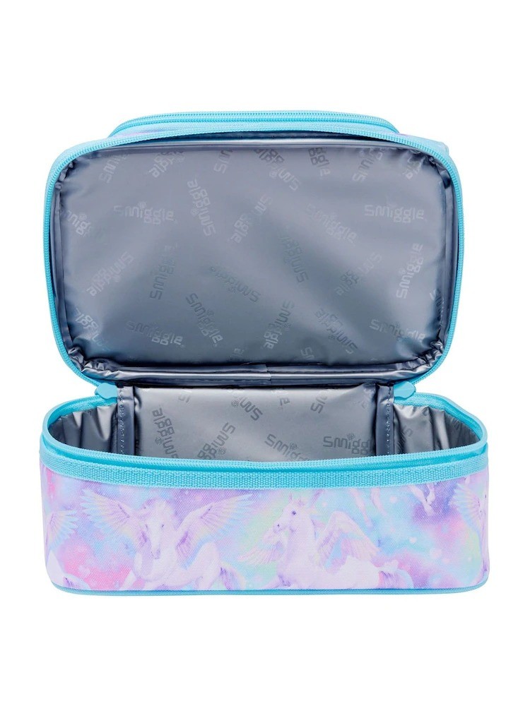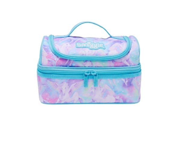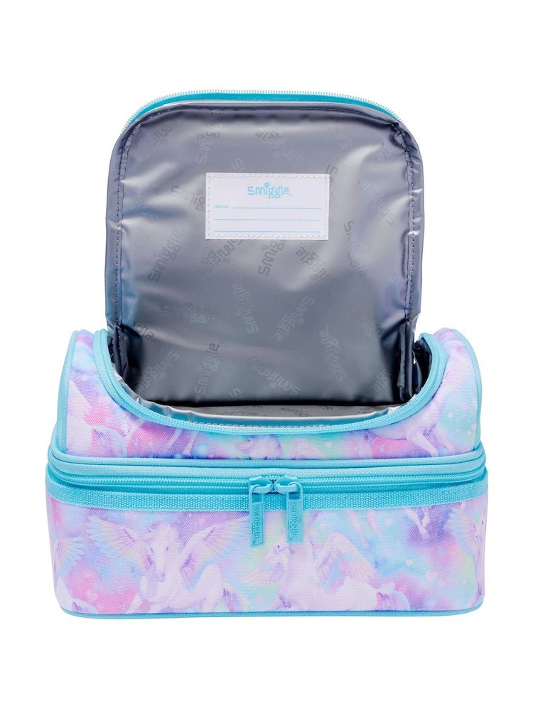 2 compartments with double zips BPA free and food safe lining Insulated and easy to wipe lining Name label Carry handle Keeps your lunch cool H 15cm x W 24.5cm x D 15.5cm