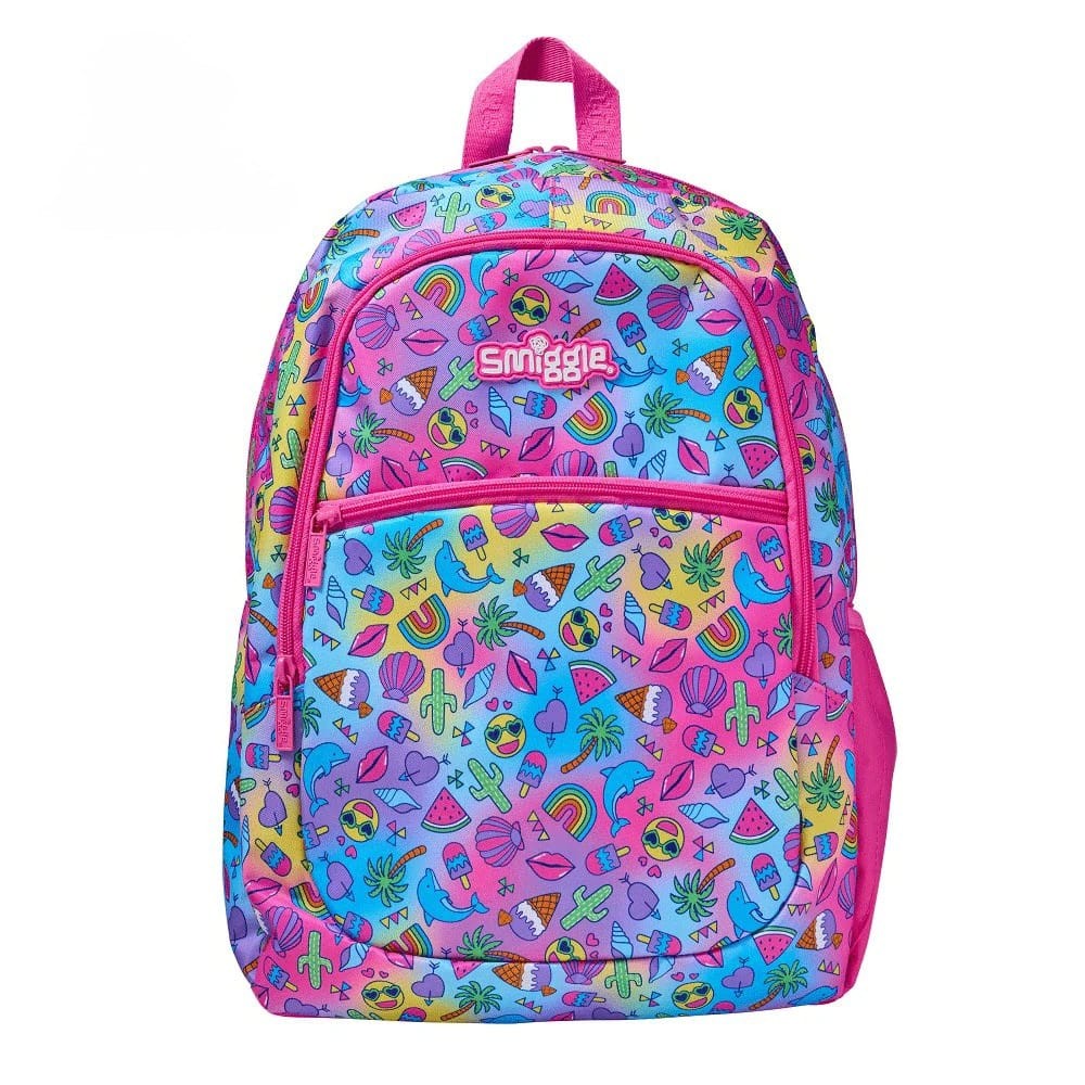 3 zipped compartments: main with double zip Drink bottle sleeve Name label H 42cm X D 18.5cm X W 31.5cm 3 zipped compartments: main with double zip Drink bottle sleeve