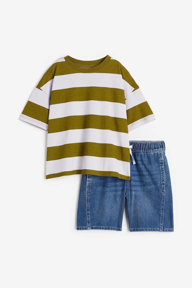 Set with a T-shirt in patterned cotton jersey and a pair of shorts in cotton denim. T-shirt with a rib-trimmed neckline and dropped shoulders. Shorts with an elasticated, drawstring waist, discreet side pockets and an open back pocket.