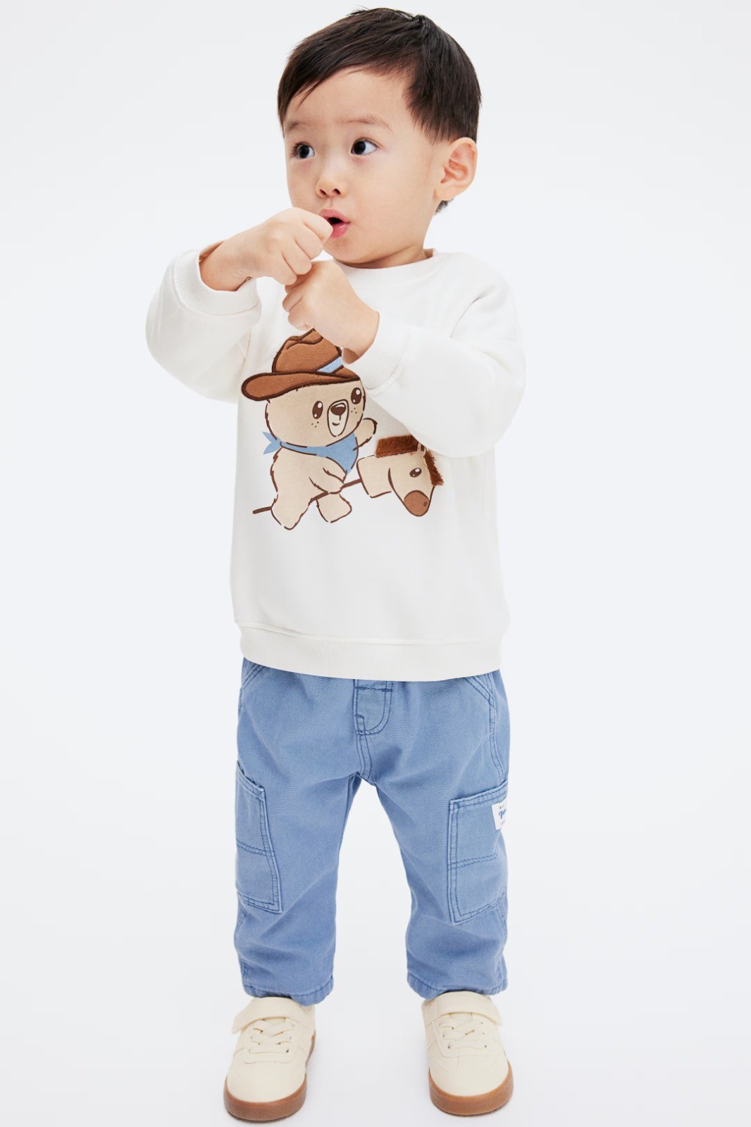 Long-sleeved top in sweatshirt fabric with a soft brushed inside and motifs on the front. Round, rib-trimmed neckline with press-studs on one side (except in sizes 2-4Y), dropped shoulders and ribbing at the cuffs and hem.