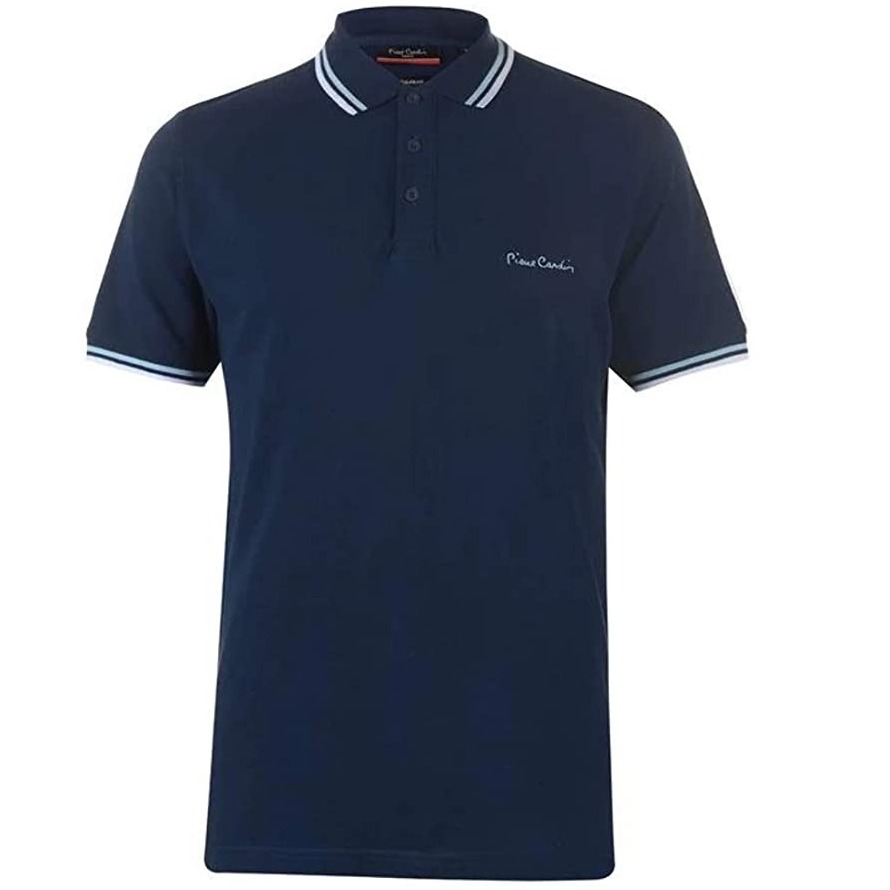 Made from a stretch cotton – blend material, this navy blue polo shirt has a classic buttoned collar and a contrast tipping around the edge of collar and sleeves.