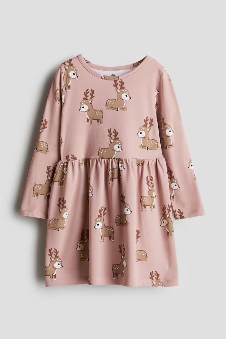 Long-sleeved dress in printed cotton jersey with a gathered seam at the waist and a flared skirt.