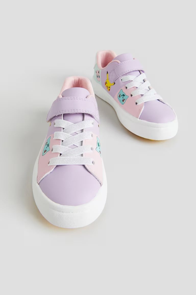 Low profile trainers in imitation leather with a print motif. Elasticated lacing and a hook and loop tab at the front, a lightly padded edge, and a loop at the back to make them easy to get on and off. Mesh linings and insoles and patterned soles. Height of soles 2 cm.
